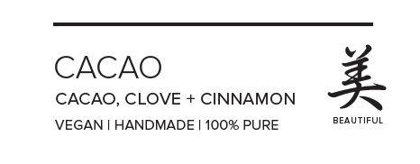 PURE INGREDIENTS: Cocos nucifera (coconut) oil*, Cacao (Theobroma cacao) powder*, Eugenia caryophyllata (clove) oil**, Ceylon cinnamon (Cinnamomum verum) powder (*Certified Organic, **Certified Therapeutic Grade Essential Oil)