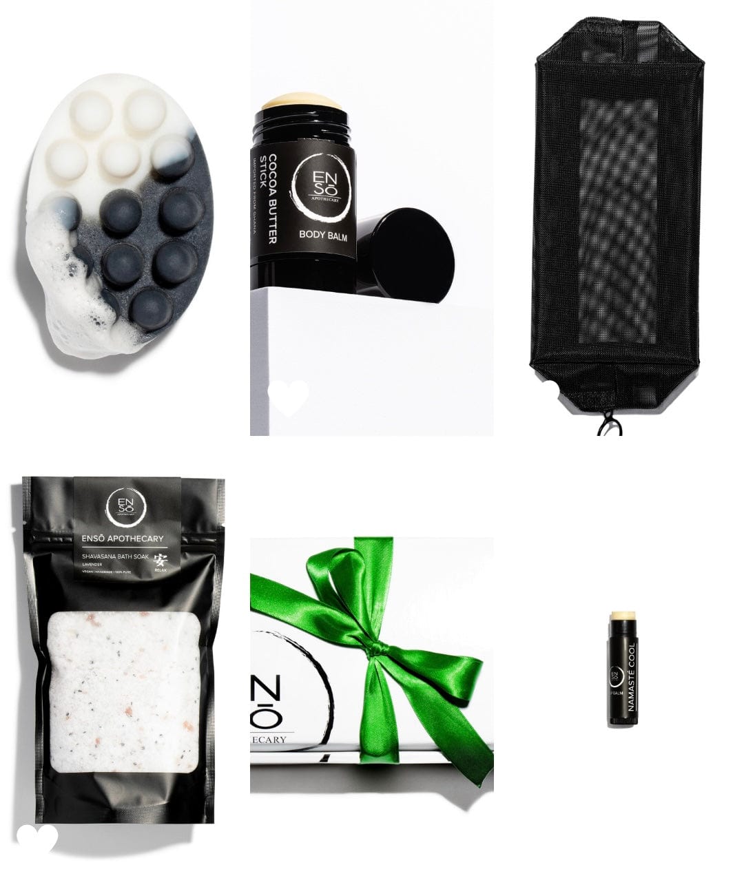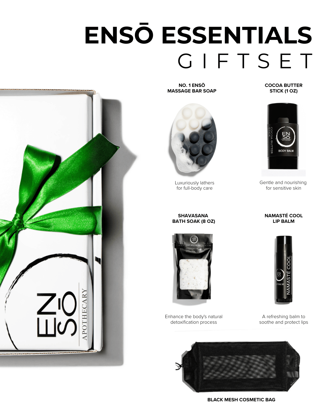End your day with a grounding soak: choose between Shavasana Eucalyptus for clarity or Lavender for deep relaxation. Complete the ritual with our Namasté Cool Lip Balm for a refreshing finish, all conveniently packed in a sleek black mesh cosmetic bag and our signature Ensō Gift Box with Bow.