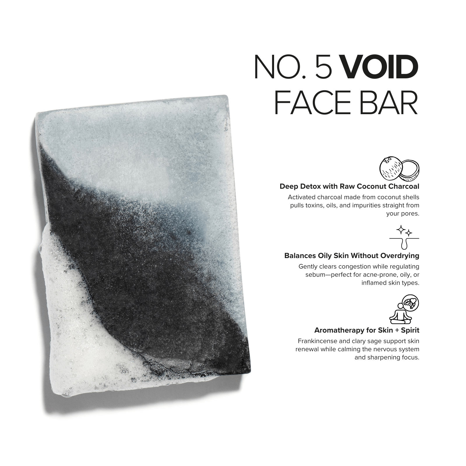 The Void bar soap is a coconut oil soap that is formulated with activated charcoal made with raw coconut shells that will deep clean, purify + detox your skin. This soap absorbs oil, dirt, metals and other toxins from pores leaving your skin detoxified, exfoliated, purified, and balanced. Made with organic coconut oil, activated charcoal, frankincense + clary sage essential oils. This bar soap is safe for full-body use.
